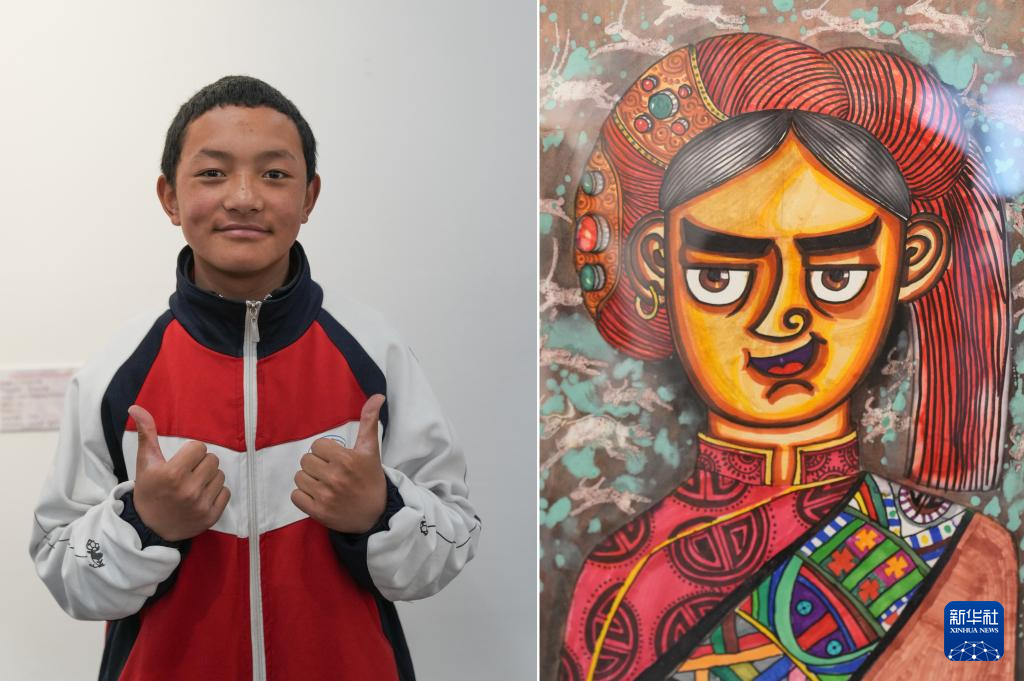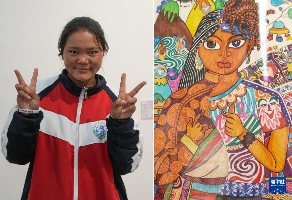 4月19日拍攝的拉薩市特殊教育學(xué)校14歲的聽(tīng)障學(xué)生貢覺(jué)央吉和她的作品《阿里服飾》(拼版照片)。新華社記者 晉美多吉 攝