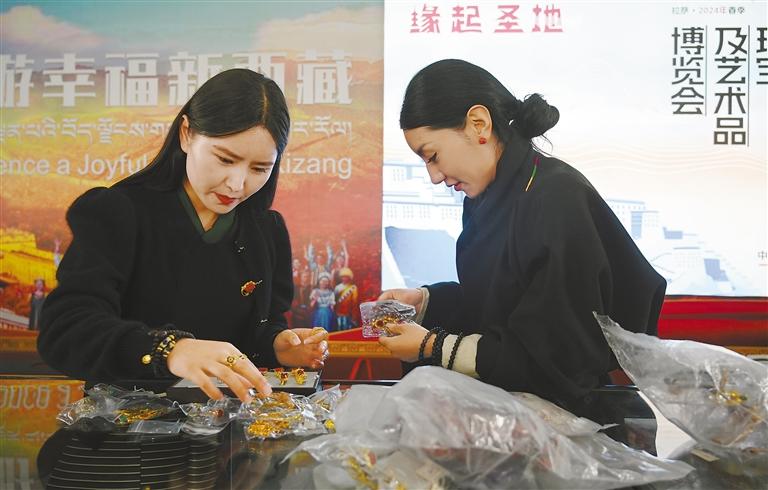 4月24日,2024年春季中國(guó)西藏珠寶及藝術(shù)品博覽會(huì)在自治區(qū)會(huì)展中心開幕。博覽會(huì)現(xiàn)場(chǎng)熱鬧非凡,許多市民游客前來參觀、選購(gòu)商品,共同感受西藏文化的獨(dú)特魅力。 圖為參展商在整理展位上的商品。 記者 王敏 攝