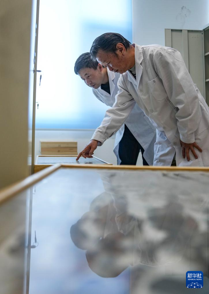 在位于拉薩的西藏自治區(qū)高原生物研究所,達(dá)娃(右)和同事查看采集到的昆蟲標(biāo)本(4月22日攝)。新華社記者 晉美多吉 攝