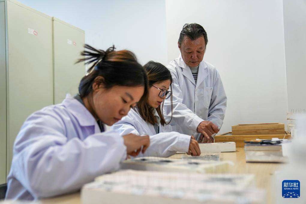 在位于拉薩的西藏自治區(qū)高原生物研究所,達(dá)娃(右)輔導(dǎo)學(xué)生制作標(biāo)本(4月22日攝)。新華社記者 旦增尼瑪曲珠 攝