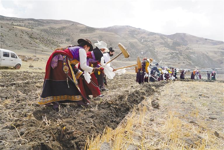 儀式現(xiàn)場(chǎng),農(nóng)牧民群眾身著節(jié)日盛裝,帶著哈達(dá)、酥油茶等聚齊在田間舉行開犁儀式,祈禱全年風(fēng)調(diào)雨順、五谷豐登。懸掛著五星紅旗和黨旗的大型農(nóng)機(jī)具和拖拉機(jī)一字排開,在“轟隆隆”的響聲中,年輕的機(jī)手們開動(dòng)拖拉機(jī)翻耕土地,婦女們熟練地躬身平土,土地逐漸變得平整松軟,一幅生機(jī)勃勃的“春耕畫卷”在加勤鄉(xiāng)的土地上徐徐展開。