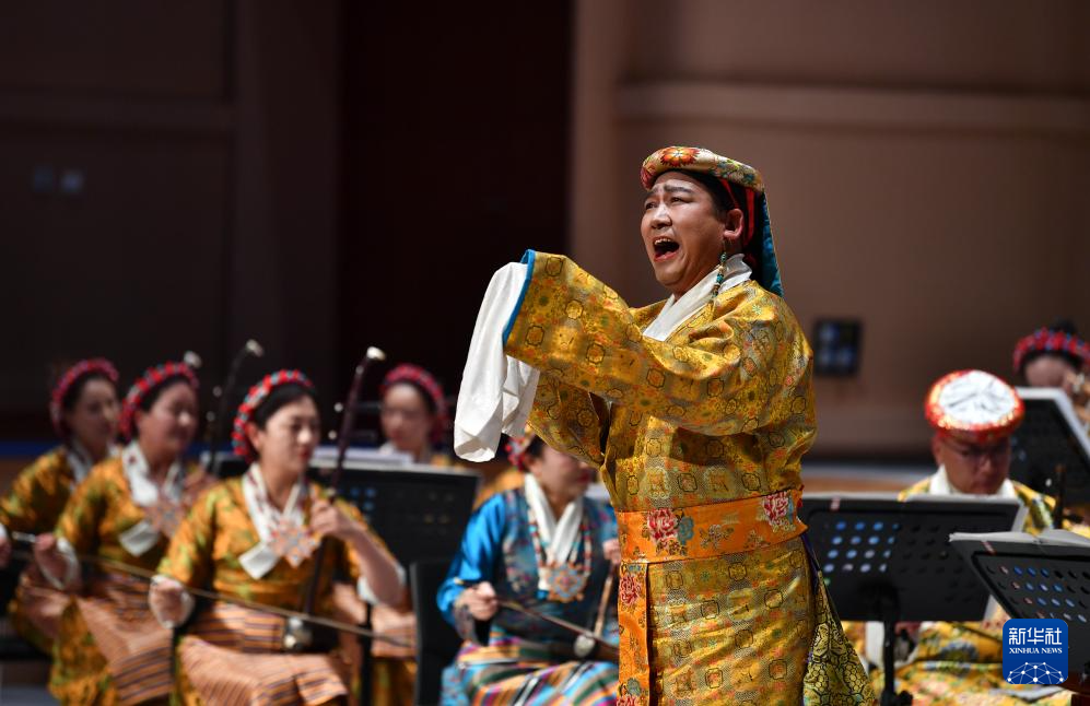 5月20日,在西藏傳統(tǒng)民族音樂會《吉祥妙音》演出現(xiàn)場,演員演唱堆諧《阿覺索朗多布杰》。新華社記者 晉美多吉 攝
