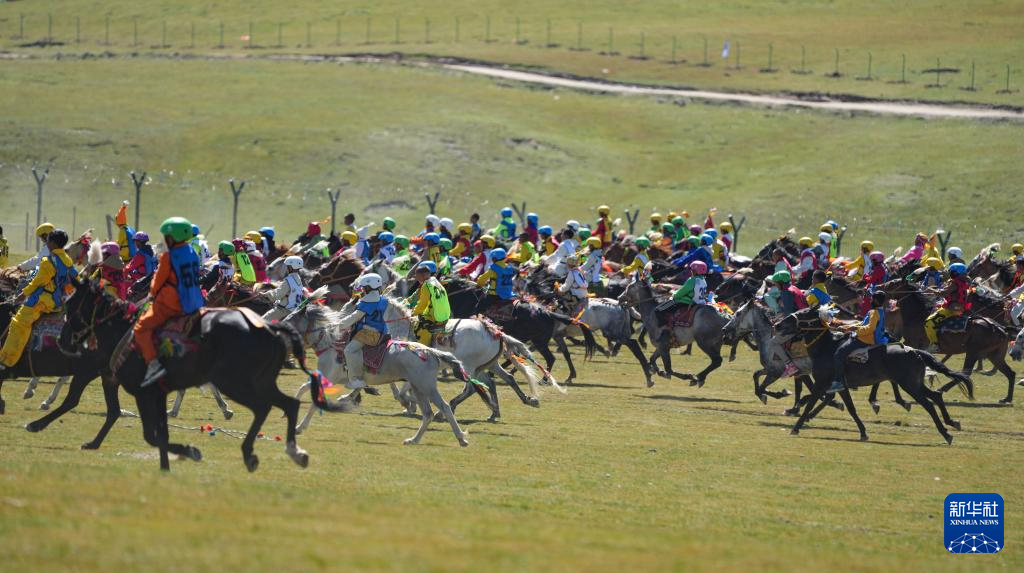 12日,10公里傳統(tǒng)大跑項目開賽,上百匹駿馬在草原上揚蹄疾奔,騎手多是十來歲的少年。15歲的普扎巴從6歲開始做騎手,曾騎著當?shù)卦S多名馬到各地參加比賽,拿過多次冠軍?!拔蚁嘈胚@次也能拿第一名。”10日,他在馬背上對記者說。