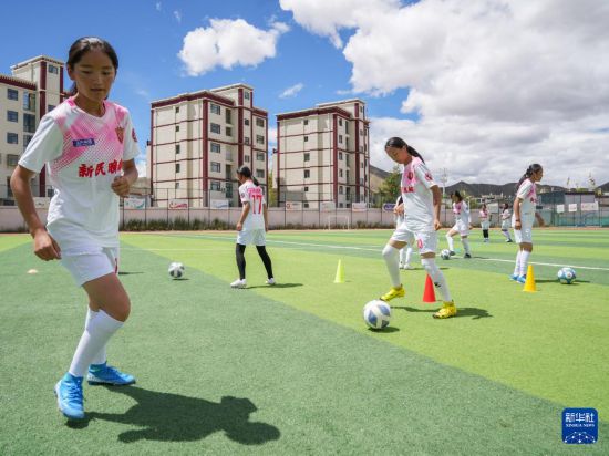 在西藏日喀則市上海實(shí)驗(yàn)學(xué)校,“珠峰雪鷹”女子足球隊(duì)隊(duì)員們?cè)诓賵?chǎng)上訓(xùn)練(9月3日攝)。新華社記者 丁汀 攝