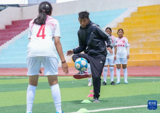 西藏日喀則市上海實(shí)驗(yàn)學(xué)?!爸榉逖棥迸幼闱蜿?duì)教練洛布桑在操場(chǎng)上指導(dǎo)球員訓(xùn)練(9月3日攝)。新華社記者 丁汀 攝