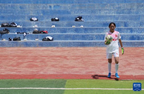 在西藏日喀則市上海實(shí)驗(yàn)學(xué)校,“珠峰雪鷹”女子足球隊(duì)守門(mén)員邊普在操場(chǎng)上訓(xùn)練(9月3日攝)。|新華社記者 丁汀 攝