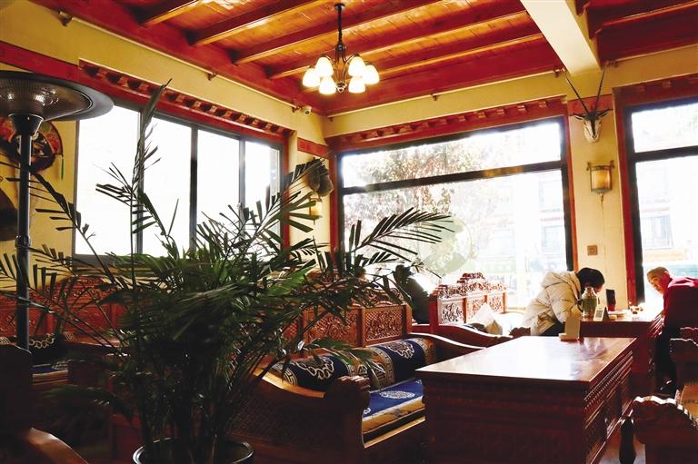 八廓街內(nèi)的古院廚房,是不少拉薩本地群眾享用午餐和下午茶的地方。正如其名,古院廚房是一個傳統(tǒng)的藏式院落,雖小卻很溫馨。院落上方布滿綠色藤條植物,陽光透過綠枝灑在餐桌上,為食物增添了誘人的色澤。