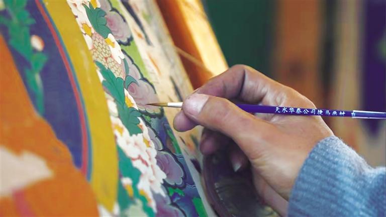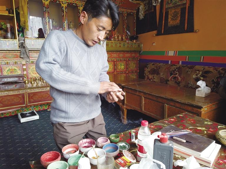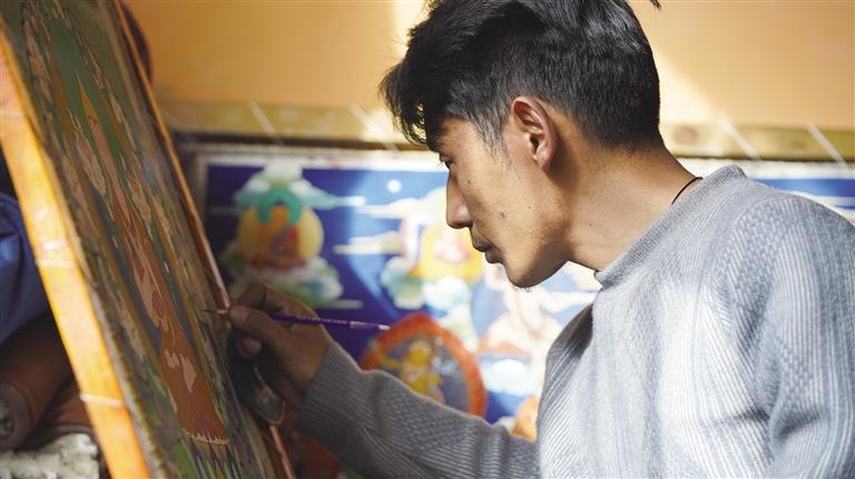 屋內(nèi),是他伏案繪制唐卡的專注身影;身旁,是父母欣慰的目光與陪伴?!白詮膶W(xué)會了唐卡繪畫后,我一直在拉薩就業(yè)謀生,但由于家里有年邁的父母需要照顧,我就回到家里一邊照顧父母,一邊繪畫定制的唐卡。這樣不僅有穩(wěn)定的收入,還能像其他人一樣靠自己的雙手過上幸福的生活?!蹦岈敶稳始?dòng)地告訴記者,他的話語中充滿了對生活的感恩和對未來的信心。