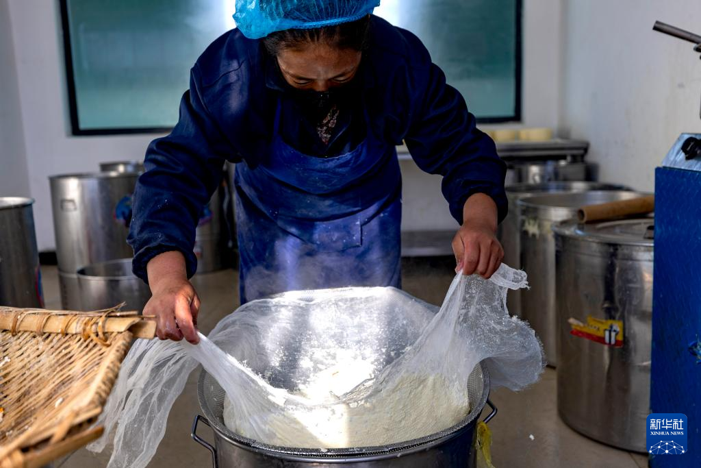 11月28日,在基地就業(yè)的當?shù)貑T工索朗卓瑪在用傳統(tǒng)工藝制作奶渣。新華社記者 姜帆 攝