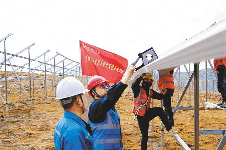 圖為華電西藏才朋光儲(chǔ)二期項(xiàng)目黨員先鋒隊(duì)的黨員們?cè)谑┕がF(xiàn)場進(jìn)行維護(hù)作業(yè)。 記者 袁海霞 鄭璐 攝