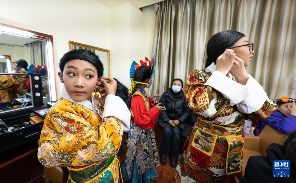小演員在準(zhǔn)備演出舞臺(tái)劇藏戲《頓月頓珠》(2月11日攝)。新華社記者 丁增尼達(dá) 攝??