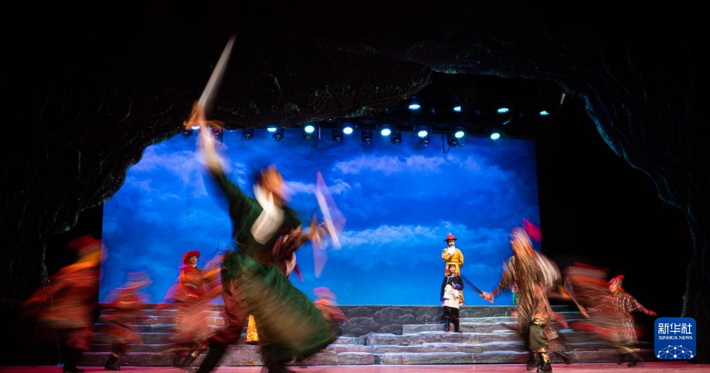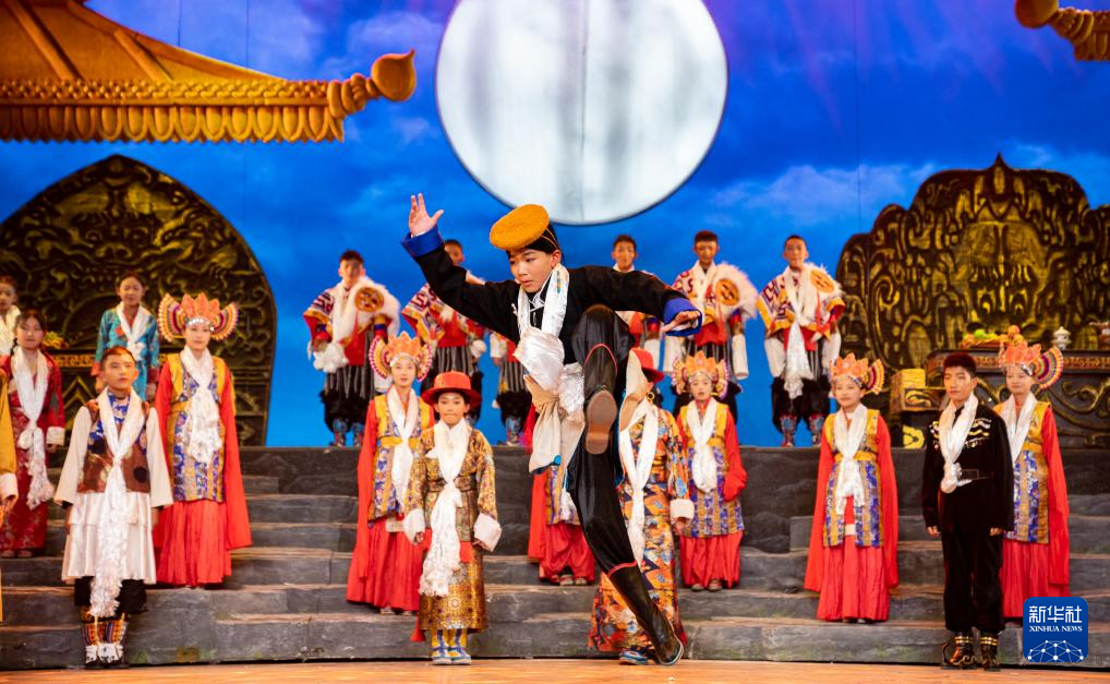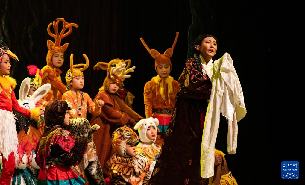 這是西藏首部少兒舞臺(tái)劇藏戲《頓月頓珠》演出現(xiàn)場,羅桑朗覺(右三)在劇中飾演“頓月”(2月11日攝)。新華社記者 丁增尼達(dá) 攝?