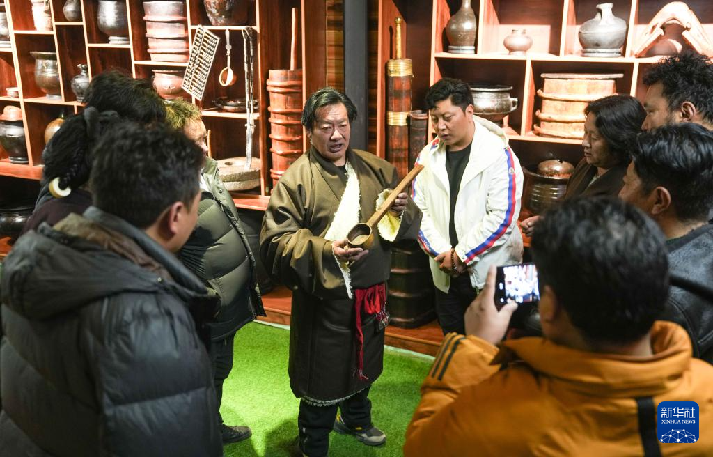 當?shù)孛袼讓<邑暡悸逋ㄖ凶螅┰凇澳寥藢殠臁辈厥讲桊^給顧客講解館藏物件(2月13日攝)。新華社記者 晉美多吉 攝