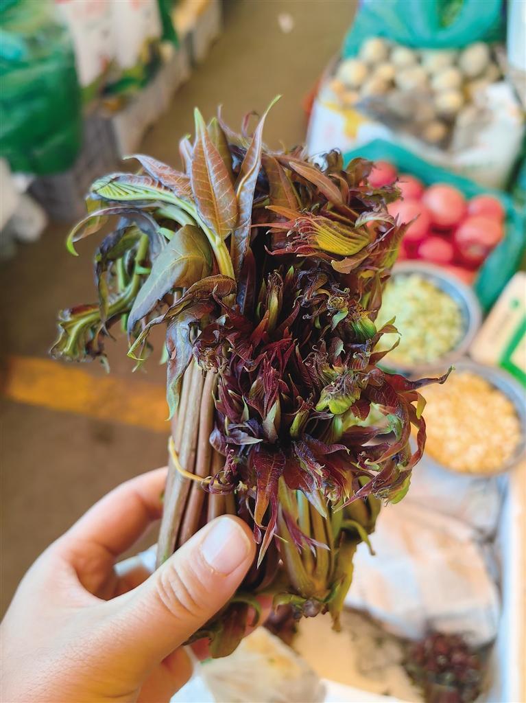 香椿芽堪稱是“春天的珍饈”,素有樹上蔬菜的美稱?!拔业睦霞以诤颖保磕甏禾煜愦幻把康臅r(shí)候,都會(huì)采摘香椿芽炒著吃,甚至吃不完的香椿芽還會(huì)用來做成香椿醬?!睆埮空f,在菜市場(chǎng),她看到紫紅色的香椿葉,散發(fā)出獨(dú)特的香氣,立馬想買一點(diǎn)回家炒雞蛋吃。