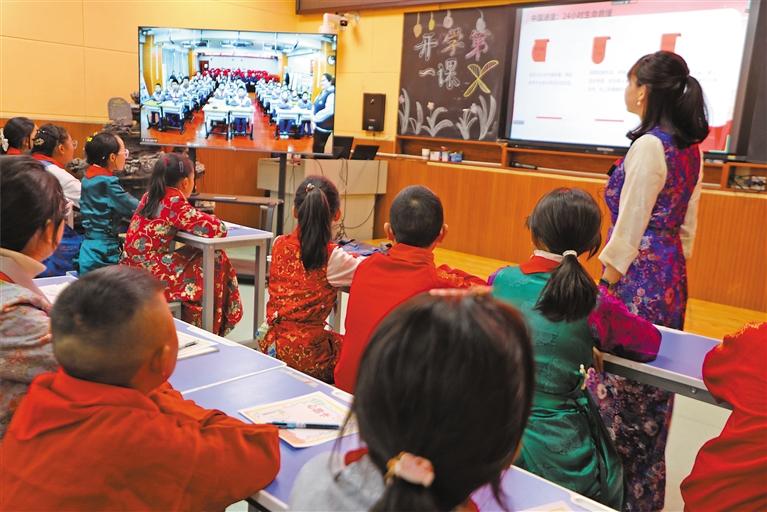 圖為兩地師生連線共上開(kāi)學(xué)第一課。記者 格桑倫珠 攝