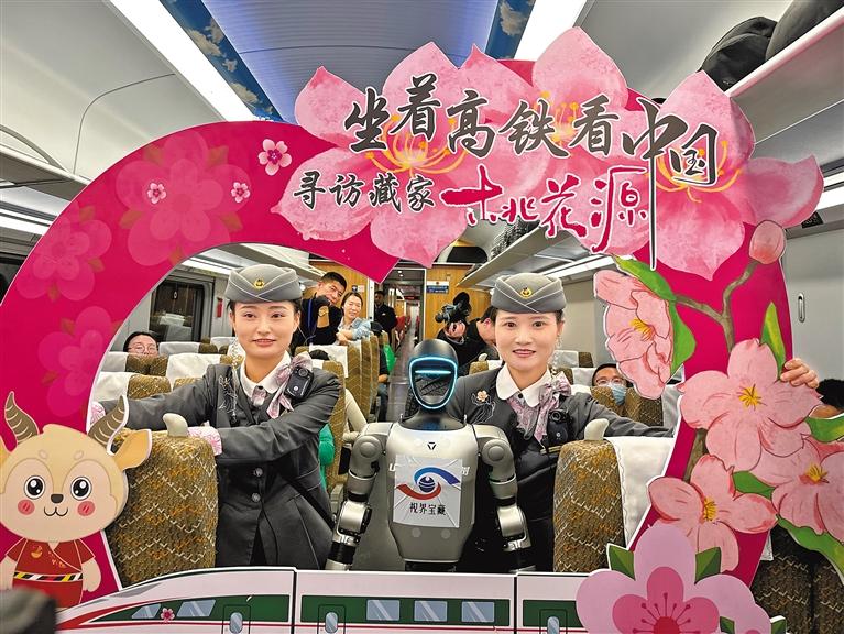 圖為拉林鐵路復(fù)興號動車組乘務(wù)員與機器人多吉合影。 記者 文鳳 通訊員 馬生明 攝