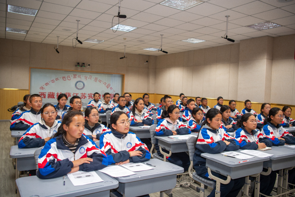 4月11日,拉薩江蘇實驗中學(xué)的學(xué)生在認(rèn)真聽江蘇省如東高級中學(xué)的宣講。新華網(wǎng) 旦增努布 攝