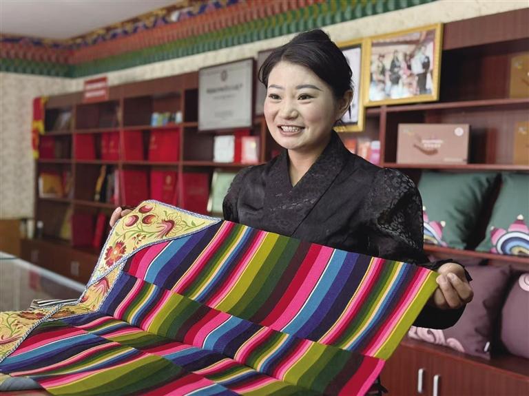 “好的技藝和原料是基礎(chǔ),創(chuàng)新的產(chǎn)品是敲門磚,走好這兩步,再打響知名度,我們的經(jīng)濟(jì)效益才能更上一層樓?!睘榱俗尭嗳肆私獍畹洌┰鲎扛聨е献魃绲漠a(chǎn)品頻繁亮相藏博會(huì)等平臺(tái),用現(xiàn)場(chǎng)編織演示和文化講解,讓世界讀懂“彩虹圍裙”的故事。