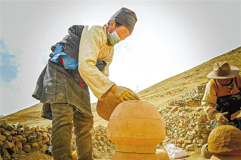 彭崗陶器制作工序繁復,需歷經取土、運輸、粉碎、塑型、曬干、上水、燒制、成型、上漆(釉)等9道流程。僅取土環(huán)節(jié)便大有門道。年幼的桑珠緊隨舅舅,攀上海拔4475米的扎拉山山頂,在那處獨特土源地采擷優(yōu)質黏土。