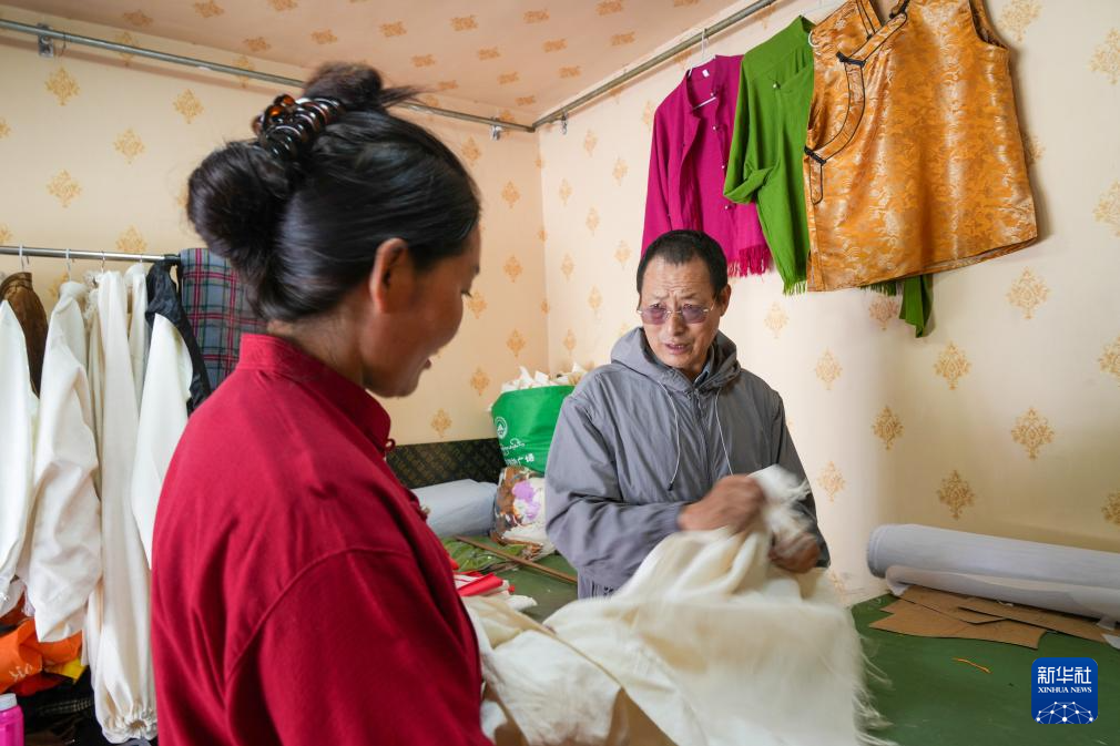 洛桑麥朗來(lái)到畢業(yè)學(xué)生開(kāi)設(shè)的店鋪,現(xiàn)場(chǎng)示范制衣過(guò)程中的細(xì)節(jié)(8月15日攝)。新華社記者 晉美多吉 攝