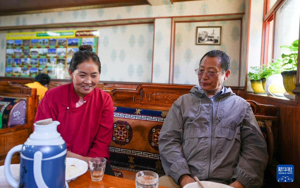 洛桑麥朗(右)和畢業(yè)學(xué)生在甜茶館吃午飯時(shí)回答學(xué)生的問(wèn)題(8月15日攝)。新華社記者 晉美多吉 攝