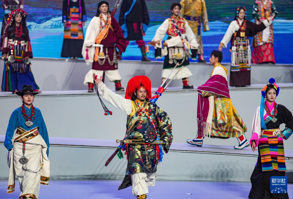 模特在首屆西藏“衣脈相承”服飾文化周走秀現(xiàn)場(chǎng)展示傳統(tǒng)服飾(2025年1月5日攝)。新華社記者 晉美多吉 攝
