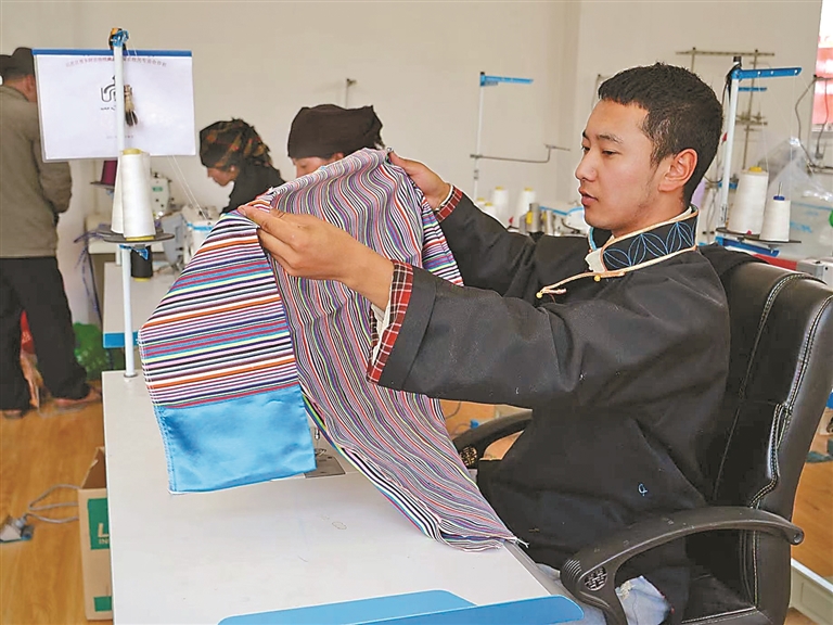 技藝的創(chuàng)新與市場的拓展,也為家鄉(xiāng)的農(nóng)牧民群眾帶來了實實在在的收益。始終心系群眾的米瑪堅才,系統(tǒng)培訓(xùn)了18名農(nóng)牧民,使他們從零基礎(chǔ)慢慢成長為熟練掌握藏戲服飾制作技藝的手工藝人,不用背井離鄉(xiāng)就能在家門口掙錢?!耙郧翱糠N地過日子,收入不穩(wěn)定,現(xiàn)在在合作社有固定收入,一年下來能掙3萬多元,顧家掙錢兩不誤,特別知足?!焙献魃绲霓r(nóng)牧民員工談起這份工作,臉上滿是笑意。