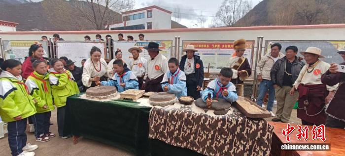 圖為俄洛鎮(zhèn)賽事活動(dòng)中組織學(xué)生體驗(yàn)傳統(tǒng)磨糌粑技能。卡若區(qū)融媒體中心 供圖
