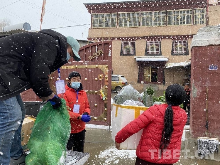 圖為理塘團縣委“青年突擊隊”風雪中免費跑腿為抗疫“宅家”群眾送物資上門