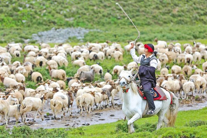 2015年以來(lái),貢覺(jué)縣引進(jìn)先進(jìn)養(yǎng)殖技術(shù),建立健全阿旺綿羊養(yǎng)殖繁育體系,實(shí)現(xiàn)了阿旺綿羊生產(chǎn)養(yǎng)殖規(guī)?;?、產(chǎn)業(yè)化,帶動(dòng)了農(nóng)牧民脫貧增收。 圖為貢覺(jué)縣阿旺鄉(xiāng)多熱村村民波澤正在放牧家里的阿旺綿羊。記者 陳志強(qiáng) 攝