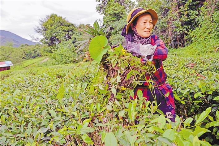 圖為墨脫縣背崩鄉(xiāng)背崩村村民在茶場(chǎng)給茶樹修剪枝葉。記者 張猛 通訊員 王顯琴 攝