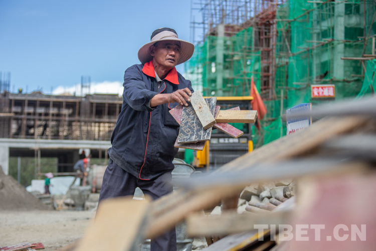 圖為隆子縣隆子鎮(zhèn)扎果村村民旺堆在隆子縣日當(dāng)鎮(zhèn)宗那建筑有限公司正在建設(shè)中的祿東贊大酒店工作攝影:趙耀