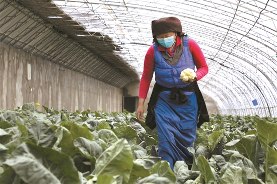 圖為當?shù)厝罕娫谀窆たh現(xiàn)代農(nóng)業(yè)示范園溫室大棚收花菜。 拉薩融媒記者 貢嘎來松攝