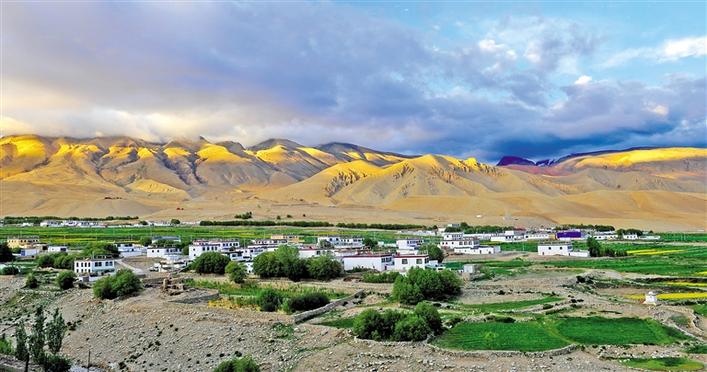 順著巍巍納木那尼山腳一路向著南方前行,幾經(jīng)盤旋,快到普蘭縣城之際,在蒼茫的雪山和險(xiǎn)峻的河谷間,一大片平整的坡地映入了眼簾。坡地上潔白的屋舍、綠色的青稞、成片的樹林,還有黃色的油菜花構(gòu)成了一幅仿佛油畫的田園美景。
