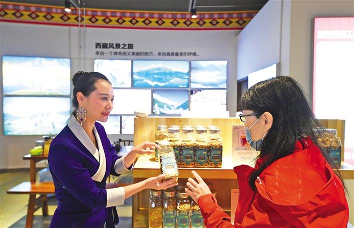 開館當(dāng)日,展銷人員身著盛裝詳細(xì)介紹了來自雪域高原的類烏齊牦牛肉干、卡若香豬臘肉、水磨糌粑、那曲蟲草、索多西辣椒醬、達(dá)美擁葡萄酒、察雅蘋果醋等300余種西藏特色農(nóng)特產(chǎn)品和易貢藏刀、丁青象牙玉器、墨脫石鍋、左貢木碗、藏毯、藏靴、藏香等近100種民族手工藝品,琳瑯滿目的民族特色產(chǎn)品吸引了不少市民駐足選購(gòu)。