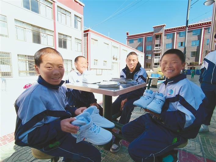 領(lǐng)到運(yùn)動鞋的學(xué)生們開心不已。記者 扎西頓珠 攝