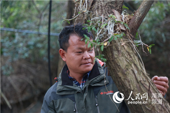 譚躍平正在察看石斛的長勢(shì)。李芳森 攝