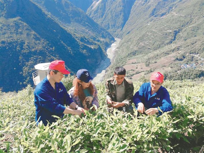 圖為華能雅江公司駐村干部與當(dāng)?shù)匕傩找黄鸩榭床枞~長勢(shì)。記者 楊小娟 攝