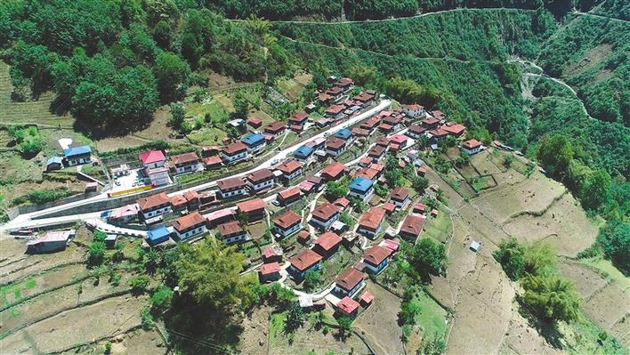 從公路上遠眺西藏自治區(qū)阿里地區(qū)日土縣日松鄉(xiāng)甲崗村,只見一大片紅檐白墻的兩層居民房矗立在綠中帶黃的草原上,家家戶戶屋頂都插著五星紅旗,迎風(fēng)招展、格外鮮艷。