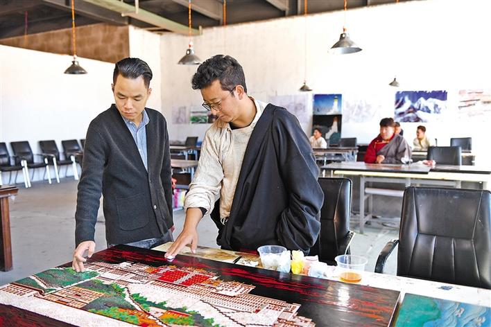 圖為昌都市類扎旦民族文化手工藝工貿(mào)有限公司的技師正在指導(dǎo)學(xué)員創(chuàng)作。記者 丹增群培 攝