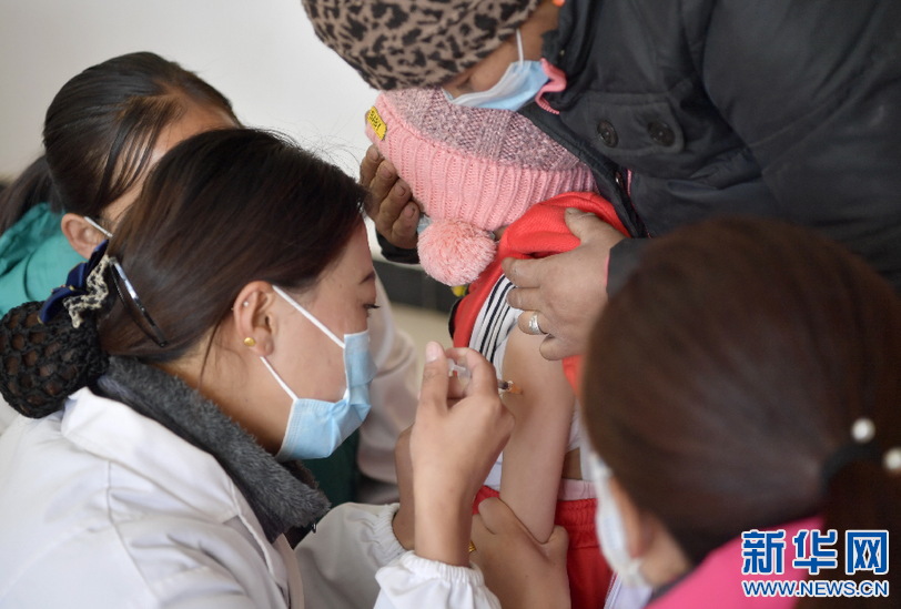 在西藏山南市貢嘎縣吉雄鎮(zhèn)紅星社區(qū)便民服務(wù)中心,縣疾控中心的醫(yī)生為小朋友接種疫苗(11月25日攝)。新華社記者 張汝鋒 攝