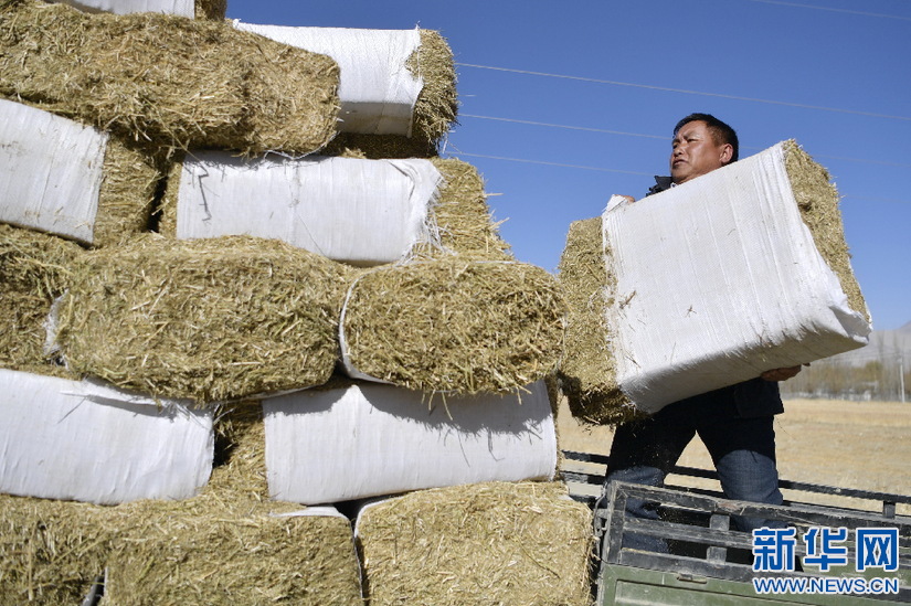 西藏山南市貢嘎縣吉雄鎮(zhèn)紅星社區(qū)致富帶頭人、奶牛養(yǎng)殖基地負責(zé)人邊巴碼放冬儲飼草(11月25日攝)。新華社記者 張汝鋒 攝