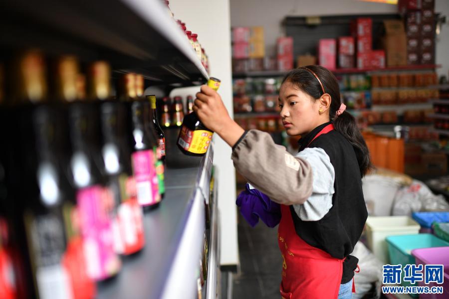 西藏昌都市丁青縣尺牘鎮(zhèn)烏巴村村民斯朗德吉在尺牘鎮(zhèn)的一家超市里打工(9月18日攝)。2018年,斯朗德吉和家人從烏巴村搬遷到尺牘鎮(zhèn)易地扶貧搬遷安置點(diǎn),住進(jìn)了寬敞明亮的新房子。斯朗德吉還就近在安置點(diǎn)附近的超市找到了工作,每個(gè)月有2000元的收入。新華社記者 詹彥 攝