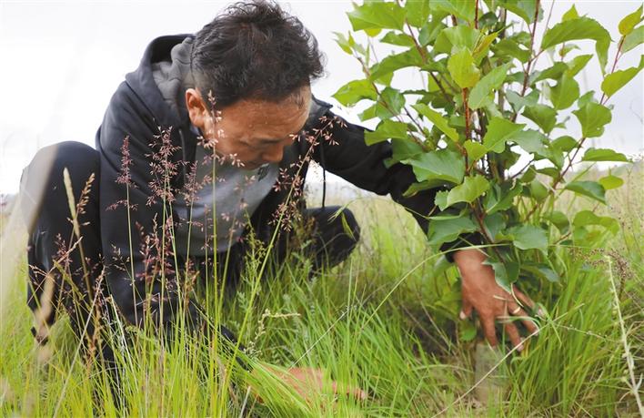 索朗羅布在檢查樹的長(zhǎng)勢(shì)(2020年8月8日攝)。新華社記者 覺果 攝