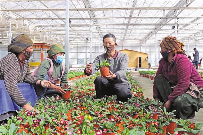 林周縣陽(yáng)光溫室示范園區(qū)技術(shù)人員在指導(dǎo)村民種植花卉。
