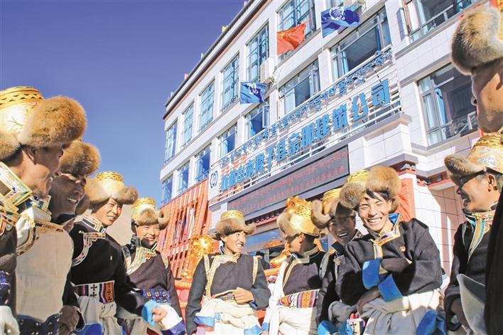 隆子縣宗那建筑公司新辦公樓前,農(nóng)牧民務(wù)工人員慶祝企業(yè)喬遷。