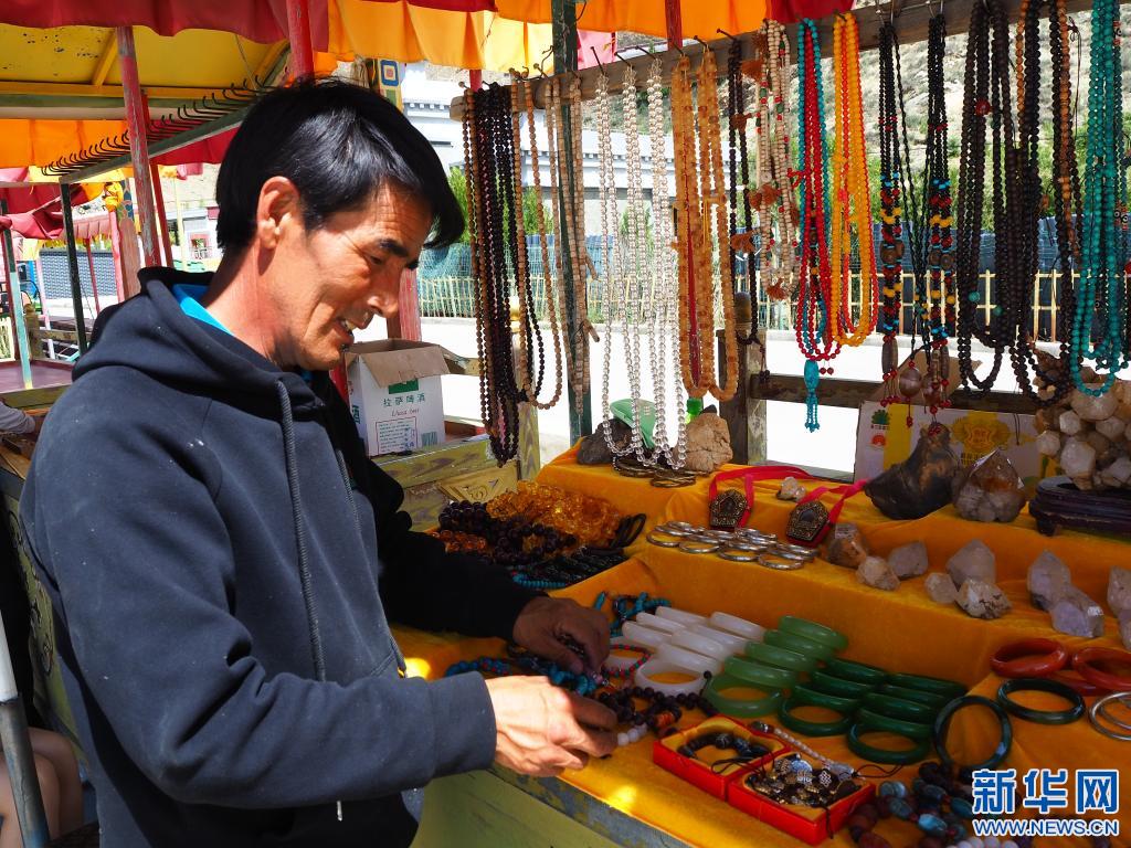 西藏山南市乃東區(qū)門中崗社區(qū)居民頓珠白瑪在自己的工藝品攤位上(6月24日攝)。新華社記者 金一清 攝