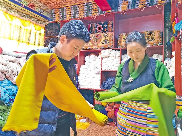 日喀則市仁布縣德吉林鎮(zhèn)德旦康薩傳統(tǒng)手工業(yè)農(nóng)牧民專業(yè)合作社負責人旦真正在查看產(chǎn)品質量。記者 扎西頓珠 攝