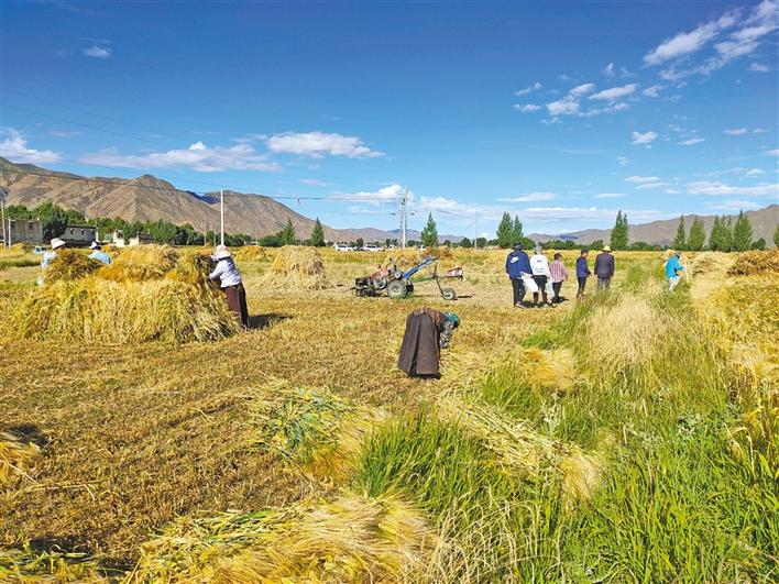 日喀則市江孜縣重孜鄉(xiāng)群眾在搶收青稞。本報(bào)記者 李梅英 攝