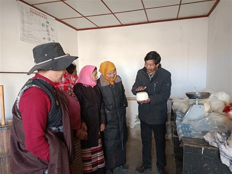 馬村草場(chǎng)遼闊,有著養(yǎng)殖犏牛等牲畜的良好自然條件。以前該村由于一直依靠傳統(tǒng)方式養(yǎng)牛,規(guī)模小、科技含量低、品種老化、產(chǎn)業(yè)帶動(dòng)力不明顯,一直處于“家家養(yǎng)牛家家窮”的狀態(tài)。2013年,在拉薩市委組織部(駐村工作隊(duì))的幫扶下,投入90萬元成立了堆龍德慶區(qū)馬鎮(zhèn)馬村平措犏牛養(yǎng)殖合作社。接下來的幾年不斷擴(kuò)大養(yǎng)殖規(guī)模和提高養(yǎng)殖經(jīng)營水平,建成了馬村高原特色犏牛養(yǎng)殖及乳制品加工銷售一體化養(yǎng)殖基地,其乳制品深受市場(chǎng)的歡迎。目前,合作社有犏牛100多頭,帶動(dòng)5人就業(yè),2019年起除了與其他村集體經(jīng)濟(jì)收入一起給常住戶分紅外,每年向本村建檔立卡貧困戶分紅?!拔覀兇褰?jīng)過發(fā)展,成立了犏牛養(yǎng)殖合作社,合作社的收入一年比一年好。今年,村集體經(jīng)濟(jì)為我們脫貧戶每戶分紅2900元,我們特別開心。今后也希望能更多地參與到村集體發(fā)展中,學(xué)好技術(shù),讓家庭條件越來越好?!贝迕衤迳8吲d地說。